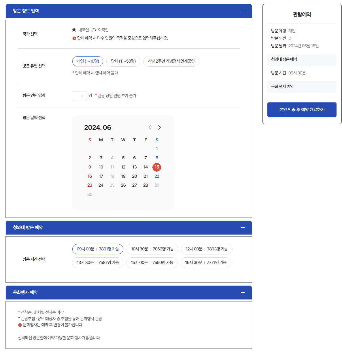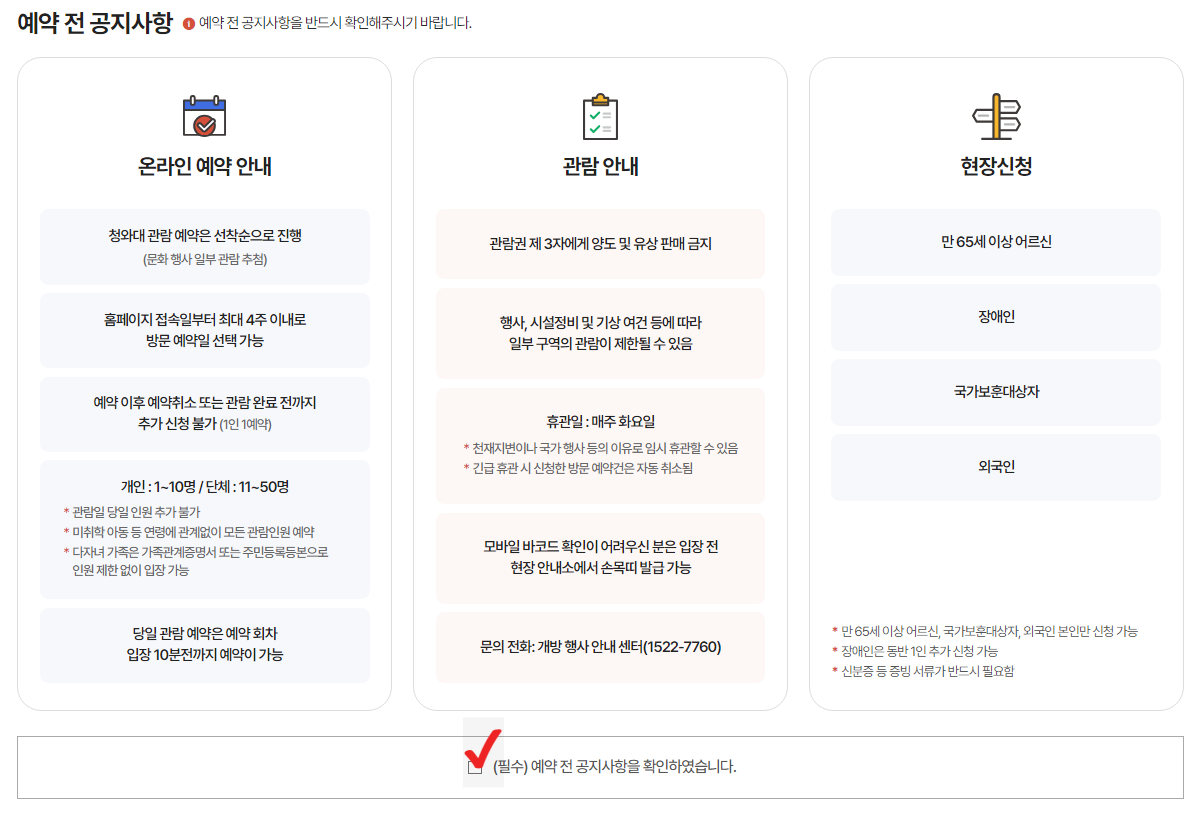 ✔️ 청와대 관람 예약은 선착순으로 진행됩니다. (일부 문화 행사 관람은 추첨으로 진행됩니다.)